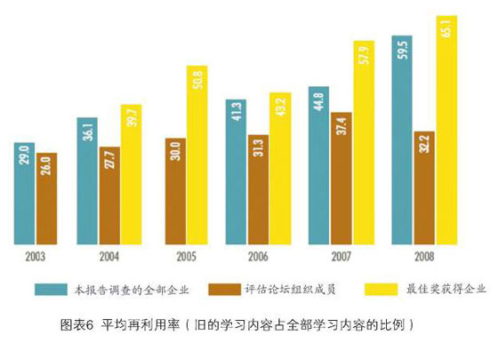 与前几年相比,负责学习的专业人士在2008年承担了更多的责任。即使考虑到企业用于外包的预算比例的差异,每位负责学习的职员培训员工的平均数仍从2007年的227人次上升到了2008年的253人次。这表明,每个学习专管部门与过去相比要为更多的员工服务。随着企业内部培训能力的不断提高,负责学习的专业人士在不断变化的行业气氛之下变得更有效率。经济形势的困难可能导致一些企业裁减负责内部培训的岗位,但留下来的内部培训人员很快就适应了新的形势,承担起与前几年相同的工作量。