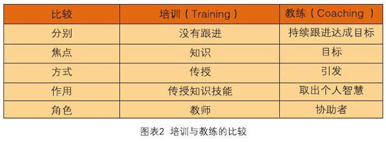 沈军:我想企业教练跟一般的培训主要的不同有这样几个:企业教练是持续跟进以达成目标,而一般的培训则缺乏跟进;企业教练着重的目标达成,而培训重点传递的是知识;企业教练采取的是一种引发方式,培训更多的传授方式;企业教练的作用是“取出”个人智慧,培训则是传授知识和技能;企业教练扮演的是协助者的角色,培训中培训师扮演的是教师角色(见图表2)。