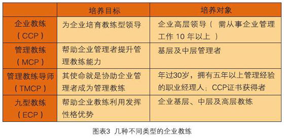沈军:企业需要教练服务,不同类型的服务对教练的专业性水准的要求是不一样的。欧美企业要求必须从事企业高管15年以上的教练才能成为专业企业教练。在中国,企业教练的培养和认证也逐渐趋于正规和专业。根据调查,52%的企业期望他们雇佣的教练是通过认证的。目前颁发教练认证证书的有国际教练协会、香港佳煊企业教练机构等机构。认证教练接受过很多专业教练课程培训,在为客户服务过程中积累了丰富的经验,并且通过严格的考试证明才能成为合格的专业企业教练。图表3为几种不同类型的企业教练列表。