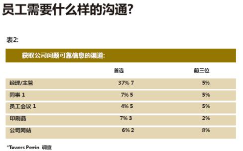 只要有可能,公司都应该确定员工的偏好。不少员工满意度调查涉及了员工的传播偏好,而Towers Pe…n全国性的人力资源调查发现了当前的趋势。员工确实有传播偏好——他们高度信任那些和工作相关的信息源,其主管或经理是第一选择,占受访者的37%,而在前三位的排名中共有75%的受访员工选择了他们。