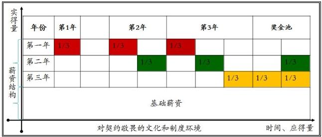 “也就是说,考核的第一年,实得是应得的三分之一;考核的第二年,实得是第一年应得的三分之一和第二年应得三分之一的和;考核的第三年,实得是第一年应得的三分之一、第二年应得三分之一和第三年应得三分之一之和,其余部分存入奖金池,正常离职审批后第三年,一次性支付相应的本金和利息,如果属非正常离职或在职期间有其他合同规定的过失则相应扣减本金和利息。这种制度的目的是为了留住关键岗位的人员,不是为了克扣员工薪资,所以双方都要建立在对契约敬畏和有依法追究的救济途径基础上。而不同岗位所享有的额度,可以根据事先约定的影子股票方式或制度规定方式。”