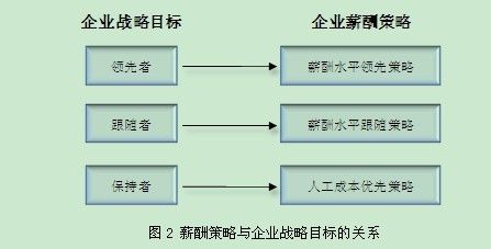 很多企业在设计薪酬体系时,往往一开始就陷入到具体的设计细节中去,没有从战略的高度进行思考,盲目照搬国外的或者别的企业的薪酬体系。其薪酬体系也许是“先进的”、“时髦的”,却不一定是“适合的”。考虑企业的发展战略,目的是了解企业需要什么样的人才水平,由此决定薪酬策略和水平。如图2所示,薪酬策略与企业的战略目标一一对应,具体可分为以下三种类型:薪酬水平领先型、薪酬水平跟随型和人工成本优先型。