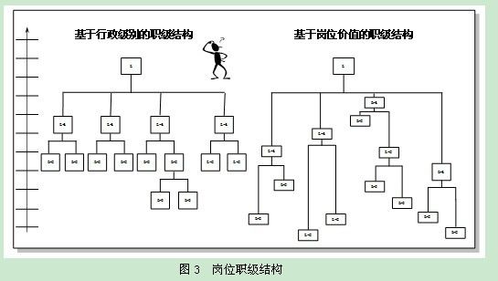 很多人认为,级别越高,工资就应越高,殊不知这种观点是错误的。岗位价值评估的意义正在于帮助建立起规范的岗位职级结构,如下图3所示,左图为按照行政级别排列的职级结构,例如:第一层为CEO或总裁,第二层级为副总,第三层级为各部门经理,第四层级为普通员工等,传统意义上会认为普通员工工资肯定低于经理,行政级别高的岗位,其工资肯定高于行政级别低的岗位的工资,但这种说法是不正确的,岗位职级高低应根据岗位的价值确立,如右图所示,各岗位根据其对企业的价值而付薪,例如,在某些方面有专长的人员工资就可能比经理的工资高,比如企业的培训师,一个好的培训师其薪酬甚至可能超过人力资源总监。