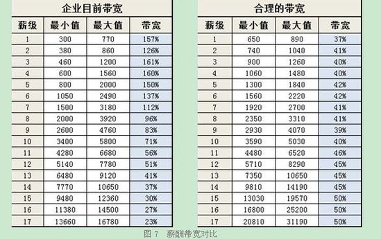 但现实中很多企业为了简便,将所有的薪级的带宽都设计为相同的宽度,甚至岗位价值低的岗位带宽反而比岗位价值高的岗位大,根本起不到对关键人才的保留作用。如图7左图所示,薪级低的岗位带宽反而大,而越到高层,薪酬带宽却越变越小。岗位薪级为15级的员工,其岗位薪酬带宽仅为30%,最大值与最小值之间仅相差2880元;而位于最高薪级17级的员工,其薪酬带宽仅为23%,这样的比例根本不足以保留和激励核心员工。合理的带宽在一个薪级范围内可以一致,但总体趋势应该按照薪级的增加而增大,如右图所示,从上到下,带宽随着薪级的增大而增大,到最高点15-17薪级的岗位带宽达到了50%,很好的起到了对关键人才的保留和激励作用。