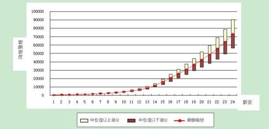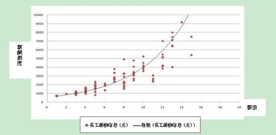 薪酬设计要保证倾斜关键岗位,重点激励的原则,因此,在设计薪酬带宽时,岗位薪级越高(即岗位价值越高),薪酬的带宽就应该越大,如图6所示,薪酬带宽随着薪级的提高而加大。
