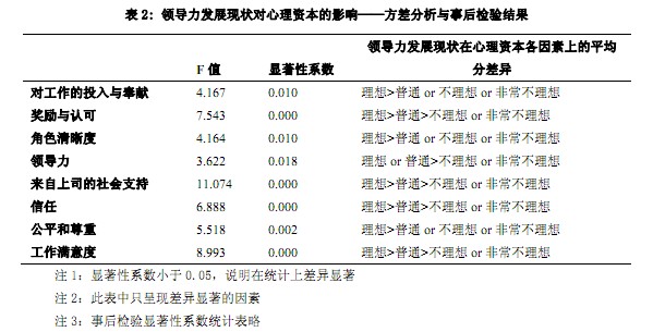 根据事后检验结果表明,领导力发展水平越高,心理资本的这 8 个因素的表现越好。见表 2。具体表现在: