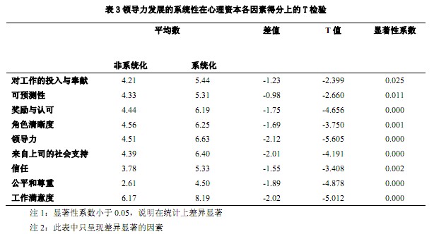 根据领导力发展的系统性在心理资本各因素得分上的 T 检验结果表明,系统化和非系统化的领导力发展企业在下列表格所列因素上得分差异显著,采用系统化的领导力发展的企业在这些因素上的得分更高,也就是说,其员工对工作的投入与奉献更高,感受到的可预测性程度更高,更充分的奖励与认可,角色更清晰,认为上司的具有更高水平的领导力并获得了来自上司更多的支持,感受到更多的信任、公平与尊重,工作满意度更高。见表 3。