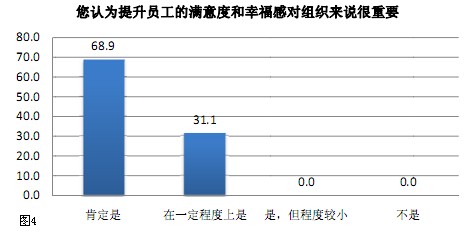 调研结果还包括企业人员对心理资本提升的意识与投入情况,结果表明,68.9%的人认为员工的满意度和幸福感对组织来说肯定很重要,31.1%的人认为在一定程度上来说很重要,而回答程度较小和不重要的人为零。见图 4。