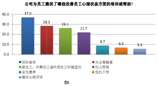 参与调研的组织投入排名前 4 位的领域包括:团队融合;办公室健康;新员工,外籍员工或外派员工的员工关怀;压力管理。见图 6。