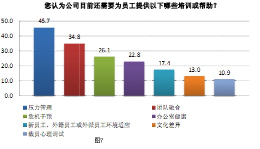 参与调研的组织未来需要投入的领域排名前 4 位的包括:压力管理;团队融合;危机干预;办公室健康。见图 7。