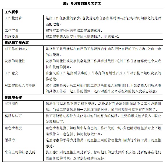 正性因素包括:自评的健康水平、工作满意度、对工作的影响力、发展的可能性、工作意义、对工作的投入与奉献、可预测性、奖励与认可、角色清晰度、领导力、来自上司的社会支持、信任、公平和尊重。