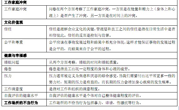 作;工作家庭冲突;文化价值观以及企业中的不当行为。每个维度中由 1-5 个因素构成。《哥本哈根社会心