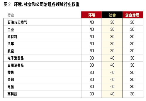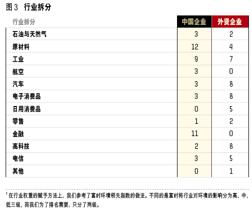 企业综合得分和排名基于三个领域和12项标准的加权累计。每个领域都由四个权重相等的标准构成,而领域的权重是由企业所在行业决定。对于高耗能、高污染行业内的企业,企业环境表现将被赋予更高的权重。例如,航空、汽车等行业的环境领域得分权重为40%。相反,对于相对低污染、低耗能行业内的企业,它们在社会领域的得分被赋予40%的权重,环境领域获得30%的权重。对于所有行业,企业治理领域的权重都是30%。