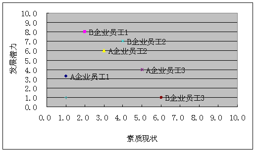 如果要进行外部比较,了解行业中其他企业同类员工的水平,可以把同类员工的素质在同一个散点图上表示,就能较为直观地看到不同企业间的人力资本差距。