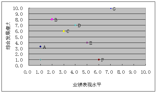 上图有几方面的作用:一、能清楚、直观地看到所有被测评人员的现有水平。二、能看到每个被测评者的能力现状,跟其他人相比,处在什么位置。三、能较为清晰地看到个体未来的发展趋势。从图上我们可以初步分辨,员工F和G是能力较好,且有较大发展潜力的;员工D和E能力居中,但D的发展潜力明显高于E。A位于横坐标的最左端,纵坐标的最下端。A是企业中的元老级人物,在创业期就加入了公司,见证了企业的发展历程。在此次测评中A表现一般,各个素质上的得分都不高,综合得分在所有中层管理人员中是最低的。并且,A年龄最大,能力倾向测验得分也是最低的,其职业生涯发展已经定型,基本上是原地踏步的状态。企业不再费心规划A未来的发展,而是考虑其退休问题。G是正直事业上升期的中年人,测评的结果表明其得分很高,综合素质较优秀。并且,量化的发展潜力结果表明,他具有较好的培养价值,是企业未来发展的中坚力量……