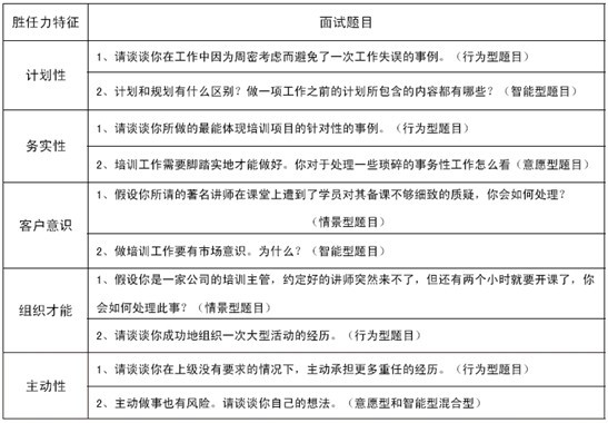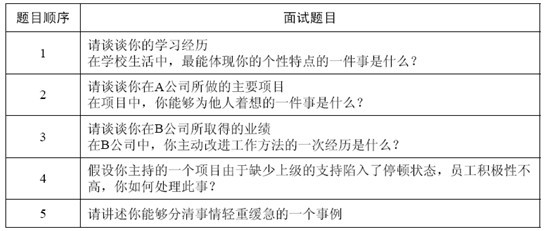 当然,两种面试类型和前述四种面试类型并不矛盾。无论是基于履历,还是基于胜任力特征,都有可能使用到前述四种面试题目类型,只不过是提问的模式不同而已。下表是基于胜任力的提问模式的一个样例: