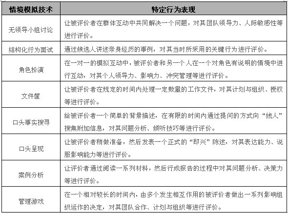 ORCSE五步法观察和记录的是行为证据,而我们观察和记录的目的就是想通过行为证据来评价候选人的胜任力。因此,首先必须要有一种成熟的情境技术,这一技术能够同时测量几个与工作绩效相关的胜任力,而且这些模拟的情境相对于候选人的管理工作来说具有一定的逼真性,能够最大限度地诱发出与绩效胜任力相关的典型行为,使评价者能够有机会收集到更多的行为证据,从而对候选人做出准确全面的评价。每一种情境模拟技术都有其最适合测量的行为表现(具体见下表)。