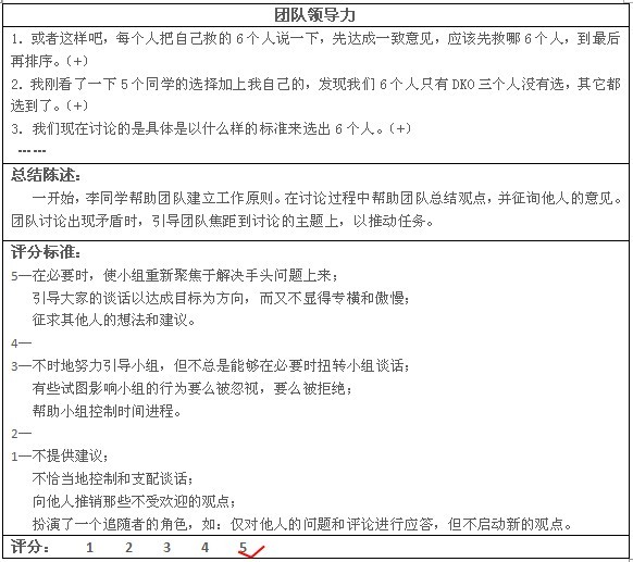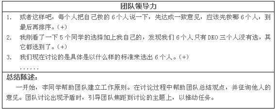 当评价者明确了不同模拟技术测量特定胜任力后,就要对胜任力的内涵、行为指标做到烂熟于心。以无领导小组活动“团队领导力”为例: