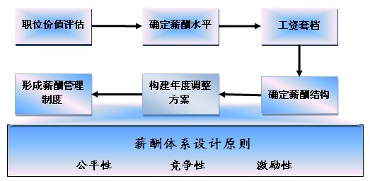 在人力资源基础管理框架下,建立科学的薪酬管理体系应该依据三个基本原则:对外的竞争性,对内的公平性与激励性,企业可支付能力。可以按如下思路进行: