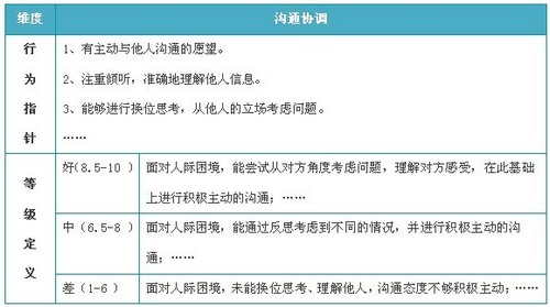在结构化面试中,事先对面试维度进行操作化,找出对应的行为指针,并且确定出等级标准及分数范围。考官只需参考相应的行为指针及等级标准就能对不同考生的不同回答进行统一的评价。按照事先确定的比例将每位应聘者的维度得分合成总分数,再将面试官的分数综合起来进行系统处理。下面是某一维度的行为指针及等级评定标准。