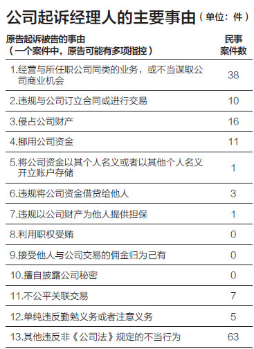 统计显示,没有一个案件涉及经理人利用职权受贿、接受他人与公司交易的佣金归为己有(即收取回扣)和擅自披露公司秘密的行为。这并不是说司法实践中没有这类案子。实际上,这类行为一旦东窗事发,通常会构成刑事罪案,因而不在民事案件的统计之中。