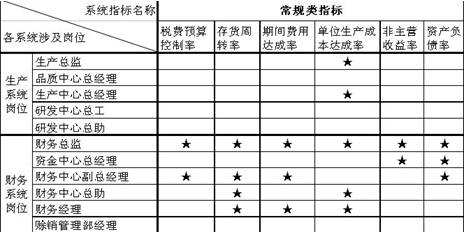 有了公司级关键绩效指标树,考核指标可以轻松分解到公司、部门级,如果再往下分解,则需要将部门层面的指标在一一分解到各岗位,部门层面的指标,一个指标分解下来可能需要多个岗位承担,如图3中的单位生产成本控制率指标,在生产系统有生产总监、生产中心总经理两个岗位来承担;而在财务系统则有财务总监、财务中心总经理助理、财务经理三个岗位来承担。因此说有了公司级绩效指标树还不够,仍需要对绩效指标继续分解,直至分解到具体岗位,最终实现每个考核指标都有一个或多个岗位来承担。岗位绩效指标库只有在第一次开发时工作量比较大,日常不需要大的变动,每年做组织架构变动时做局部调整即可。