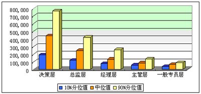 从理实人力资本管理咨询有限公司(以下简称理实HCC)的全面薪酬调研结果表明,纵观2005年北京房地产行业现金收入总额趋势,较2004年有较大幅度提升,特别是随着层级的升高增幅加剧。拿两年现金收入总额的市场中位值(市场中等水平)进行对比,其中总监层平均增幅为14%,决策层的平均增幅为17%。这也是近几年来调薪幅度最大的一年,充分说明房地产企业对中高管层人员的愈加重视。运用企业付薪的二八原则,80%的薪水确实付在了20%的核心员工身上。其中高管层的年度现金收入总额从23万—95万,跨度4倍左右。