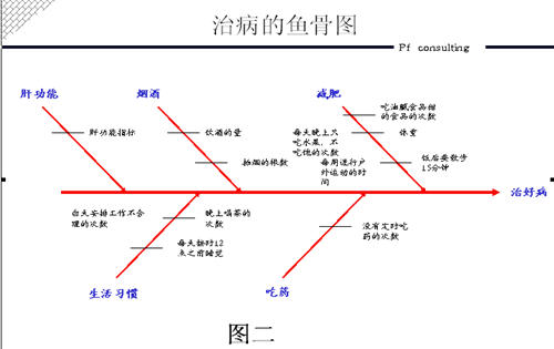 J君身高体胖,一日去某公司应聘,合格后要进行例行的身体检查,发现转氨酶指标不正常,被怀疑肝功能不正常,有肝炎的嫌疑。J君立马上医院抽血四次,甲乙丙丁肝炎都检查一次,发现不是肝炎,又去B超,最后得出结论,肝功能不正常是因为太胖的缘故。J君一边医院问诊,变着法的让人做检查,一边制定治病计划。并且画出鱼骨图如下: