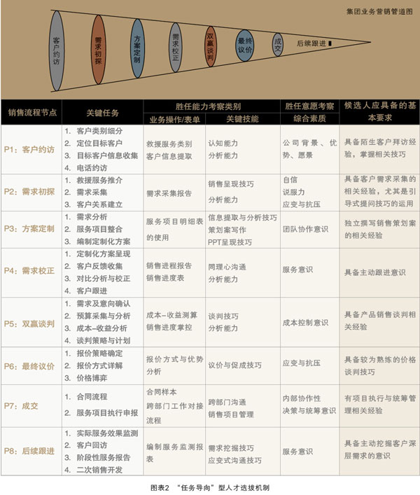 人才选拔具体思路具体来看,可以分以下两个步骤进行人才选拔工作:首先,规划出集团业务的销售流程管道图(见图表2),对其中的关键流程节点进行界定,并分解每个节点的关键任务。其次,针对所要完成的任务,分别列举在职人员在业务操作、表单填写和使用、内部流程执行、技能水平以及综合素质方面的具体要求或标准;其中,最后一列(图表2中的“候选人应具备的基本要求”)可理解为对“最低胜任标准”的描述,用于指导人才的选拔工作。
