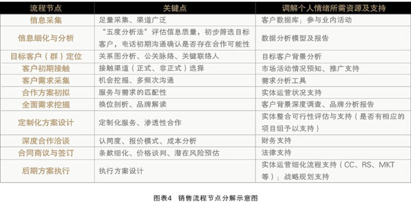 流程节点的任务分解以最新销售流程节点的分解(见图表4)为例,基于上一年度人才培训工作成果,进行销售流程优化时,需要对每个节点的关键任务或要素重新归类,并加入对所需资源的描述,使与销售工作相关联的其他部门明确应该在哪些环节给予支持;同时,任务分解也能够帮助销售人员更好地利用公司现有资源开展销售工作,使工作思路更加清晰。