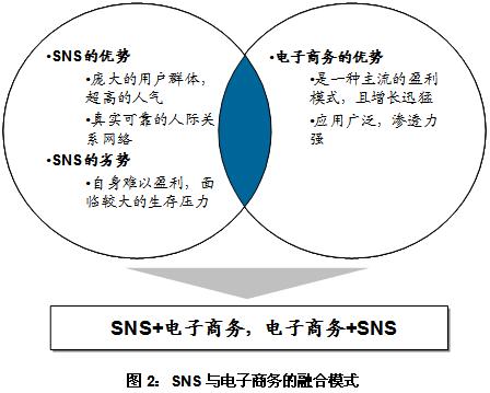 电子商务与SNS的融合有两种模式。一种是以SNS网站为基础,增加电子商务模块,或者开放平台与第三方电子商务网站合作,利润分成。前者如Facebook,于2010年底开始邀请大型的零售商在自己的网站上开店,帮他们搭建页面商店,开发销售工具,并允许客户在购买商品时进行互动。尽管目前Facebook的电子商务销售额很有限,但毕竟在SNS与电子商务的结合上迈出了实质性的一步。后者如国内的人人网推出电子商务导购平台“人人爱购”平台,与凡客诚品、京东商城、麦考林、银泰网等多家电子商务网站完成对接,提供产品导购服务,涉及产品包括服装鞋帽、美容护肤、珠宝饰品、运动户外、3C数码、食品保健及图书音像等。