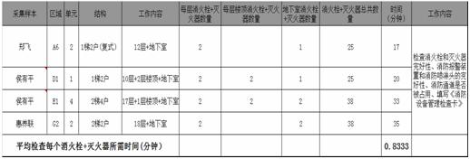第四步:随机抽取N(适量)个样本按照规定的工作标准和规程进行消防巡检,分建筑结构记录消防巡检工作效率,求出巡检单个工作对象所需时间为0.83分钟。统计样表如下所示:
