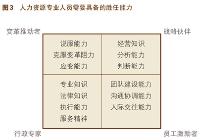 通过分析人力资源管理者的角色及其面临的挑战,HR专业人员须具备各种相关能力。美国密歇根州立大学商学院的大卫·乌里奇教授等人通过研究,将HR从业人员的胜任能力模型高度概括为个人诚信、变革管理能力、文化管理能力、人力资源管理实施能力以及经营能力等五个方面。而从HR职能所扮演的角色来看,他们需要具备的能力则包括:考虑企业当前和未来的经营目标,从而明确人力资源管理如何为企业目标的实现做出贡献的能力(战略伙伴);分析员工的流动率、保留率、生产率以及客户服务问题,并向企业提出解决这些人力资源管理问题的建议的能力(战略伙伴);克服新的人力资源管理政策、程序、技术以及职位设计方式所遭遇的抵制的能力(变革推动者);对员工提供指导和咨询,同时把他们的想法传达给管理层的能力(员工激励者);设计和运作有效的人力资源管理系统,提高人力资源管理效率,节省人力资源管理成本的能力(行政专家)。