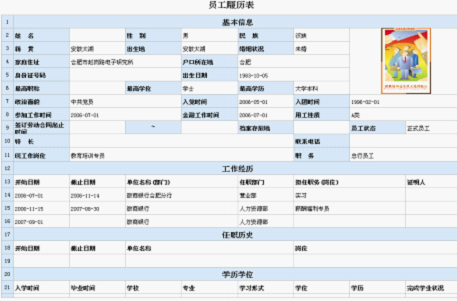 实现了对员工基本信息、任职信息、工作情况、教育情况、组织关系、社会关系管理共6大类,16小类300多个信息项的记录维护,如金融行业工作时间、人大或政协代表级别、部门绩效等;通过入职、转正、辞职、辞退、内退5大流程10多项明细流程,实现对人事事务的处理和控制,为报表统计提供数据基础,例如当月发生应届高校毕业生招聘录用事务,手工录用应届高校毕业生操作流程保留,各行人事专员依据手工的应届高校毕业生入职审批单,要求在月底30号前,通过系统中的大学生入职申请单,进行入职业务流程操作。