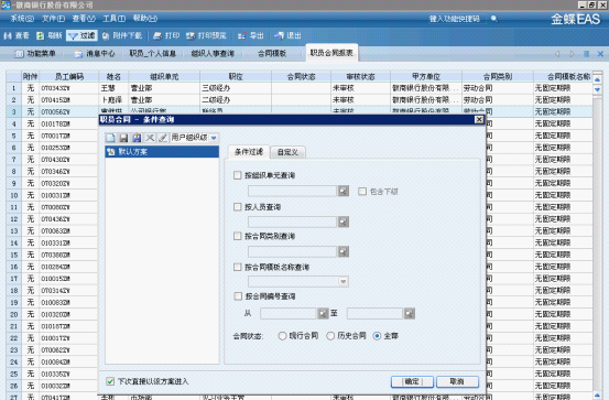 借助金蝶的HR系统,徽商银行严格按照劳动法规定实现了多种合同管理,包括员工劳动合同、培训合同、保密合同、集体合同等等。日常合同信息维护、续签、变更、终止、解除等业务都可以借助系统进行管理。系统还提供了自定义预警功能,在合同到期时,系统会自动根据原先设置好的提醒规则预警,提示HR业务人员进行相关的业务办理,如员工合同到期预警后,查看签属合同次数,如超过两次,可安排签署无固定期限合同。