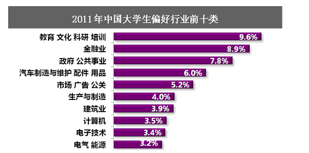 在我国“十二五”规划中,教育和文化产业各自作为独立的一篇被重点论述和讨论。因此,在今后的一段时间内,教育、文化类行业将是国家重点发展的行业,前景巨大。2011年大学生体现出对政策的高度敏感性,所以调查结果中呈现出学生群体对教育、文化类行业的偏好。