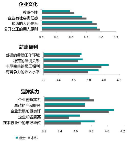 而又因为研究生在教育上的投入要高于本科生,所以研究生对自己在人才市场上的定位也更高,期待与投入和地位相符合的待遇和发展前景,尤其对于收入水平和福利状况有着很高的要求,注重可量化的待遇形式和发展机会。