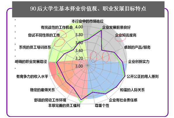 在“90后”评价心目中的第一雇主时,得分较高的项目包括良好的发展前景、知名度、市场地位、产品和服务、企业创新实力和社会责任感。90后大学生的基本择业价值观和职业发展特点,对有挑战性的工作机会、企业发展前景良好、能尝试不同性质的工作、企业知名度高更加青睐。