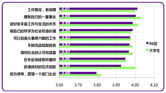 在择业价值观、职业发展目标上,90后大学生与当代大学生基本特点一致。