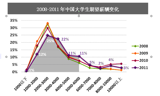 相比之前三年,2011年大学生期待薪酬出现了少许上浮趋势,但值得注意的现象是:8000元以上的高薪期待者比例经历了2010年的大幅提升后,下降较为明显(由6%将至3%)。