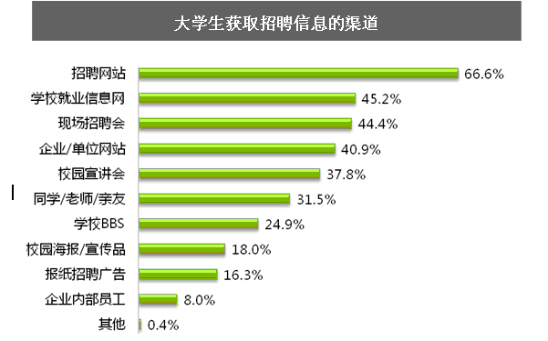 中华英才网发现,专业招聘网站上的就业信息高度集中、有完善的分类检索体系,并提供多种附加服务,对于求职大学生而言是最高效、快速、准确地获取大量信息的途径。而学校就业信息网和学校BBS排名的提升反映了高校对大学生就业工作的重视以及相关服务的不断推进,已经越来越被大学生所接受。