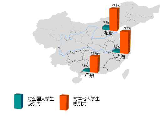 中华英才网本次最佳雇主调查发现:无论是对本地还是外地学生的吸引力上看,广州对人才的吸引力都要低于北京、上海。
