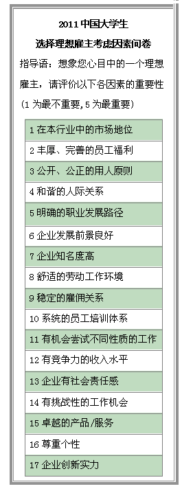1、问卷修订阶段 (2011.2-2011.3):修订获得第九届大学生最佳雇主调查问卷。