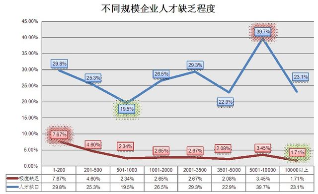 在不同规模企业的分析中,人才缺乏较为严重情况(此处统计的较大缺乏与极度缺乏)呈现了一个明显的波形状态。非常有意思的现象是在企业人员数量位于501-1000人之间的企业的人才缺口最小(19.5%),而当企业规模增长了10倍达到5001-10000之间的时候,人才缺口反而达到了最大(39.7%)。即使从不同的企业性质、企业所属行业来分析,参与调研的企业没有任何区别的在5001-10000(人)规模时遇到了人才瓶颈。