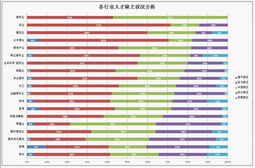 在不同的行业中,教育业(40.6%)、高科技及通讯(39.2%)、餐饮酒店业(36.0%)、零售业(35.7%)、快速消费品业(32.4%)五个行业的人才缺乏状况较为严重。与之相对的,对于人才需求度相对较小的行业,如农业(14.3%)、建筑业(16.0%)以及公共事业(17.6%)等行业人才缺口也相对较小。去年人才缺口较大的生命科学/医药业等有所好转,但零售业的人才缺口依然存在。