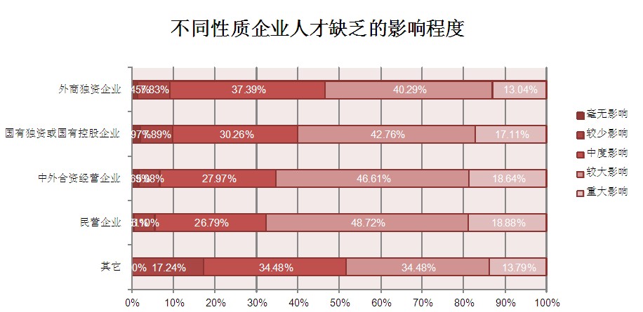 在整体人才缺乏的状况下,中国本土企业的关键人才缺乏状况要重于外资背景的企业,在关键人才争夺的博弈中处于不利的地位。在参与调研的企业中,中国本土企业(本土民营企业和国有企业)的人才缺口要明显大于外资背景的企业。民营企业(33%)和国有企业(27%)表示存在严重人才缺口,而外资背景企业处于严重人才缺乏状态的仅为21%(外商独资企业)和23%(中外合资经营企业)。