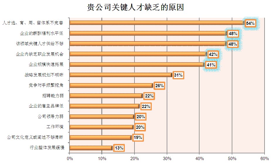 在公司关键人才缺乏原因的调查中发现,越来越多的企业意识到人才管理体系的问题才是造成关键人才缺乏的主要原因。54%的企业认为“人才选、用、育、留体系不完善”是造成人才缺乏的最大原因。而外部市场的影响因素,“企业的薪酬福利水平低”与“该领域关键人才供给不够”并列第二,为48%。而紧随其后的是,又是企业自身问题的影响,为“企业内缺乏职业发展机会”,以及“企业规模快速拓展”,分别为42%和41%。