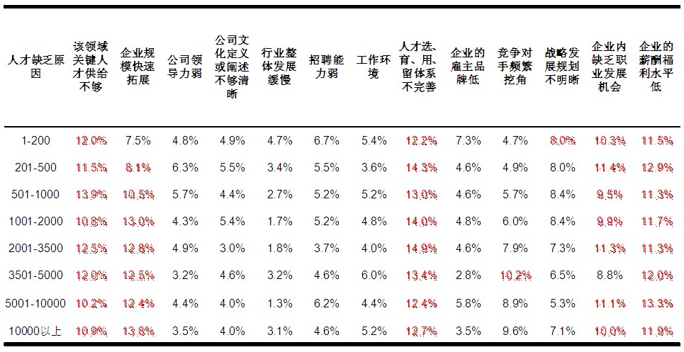 在前面关于不同企业规模的人才缺口分析中,我们发现了一个有趣的波浪形人才缺乏程度,在对不同规模企业人才缺乏原因的进一步分析中我们发现: