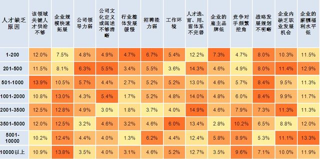 而对于整体状况分析中我们可以看到,雇主品牌低、企业发展战略缺乏等问题在小企业中较为严重,而在大中型企业中,则主要面临企业的业务拓展、竞争对手挖角等方面问题。而在5001-10000人规模的企业则呈现出一个人才缺乏问题的爆发点,除了受大型企业规模扩张、人才被挖角等问题的困扰之外,薪资的外部竞争力、招聘能力的问题也体现了出来。