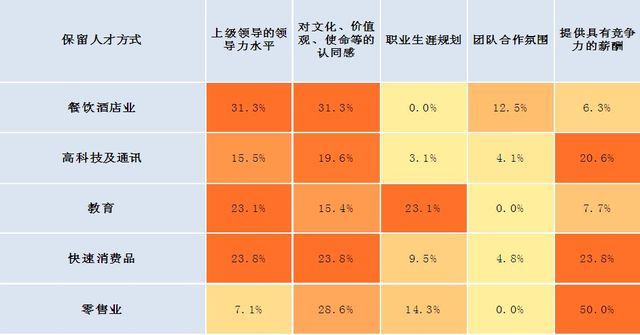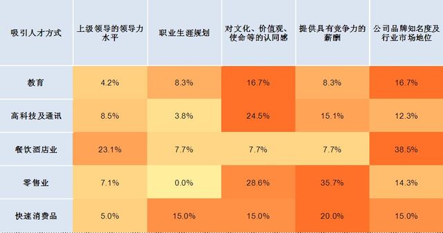 餐饮业体现出了品牌和领导力水平在员工保留中起到的关键性作用,而快速消费品行业和零售业则会侧重于薪酬方面的激励。